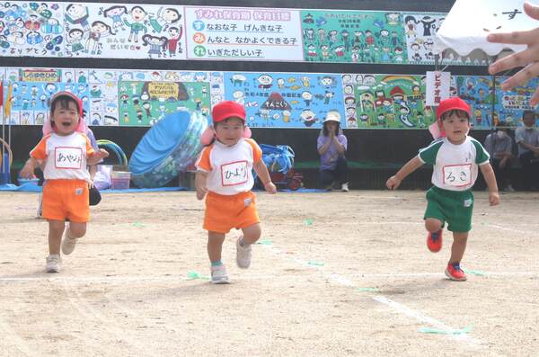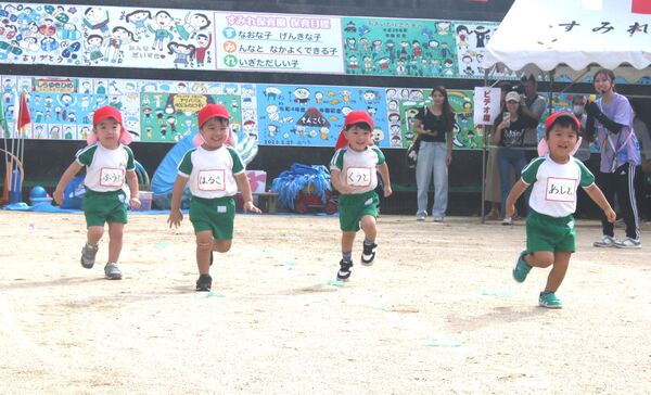 2025/10/07 運動会がありました☆(未満児) 10月5日(日)に運動会がありました!天気にも恵まれ、初めての運動会で涙が出てしまう子もいましたが、それも大切な思い出☆1才からはかけっこに加え、親子で運動会を楽しみました♪昨年はできなかったことが今年はできるようになった姿も多く見られ、本当にかわいくて素敵な笑顔をたくさん見ることができました☺ すみれ万博2025!(赤0才) ニコニコ笑顔で走りました♪(赤1才) 親子でわんわんダンス!(赤1才) よ〜し!負けないぞ〜!(赤組) 大きな魚が釣れたよ〜♪(赤組) 1 2 3 4