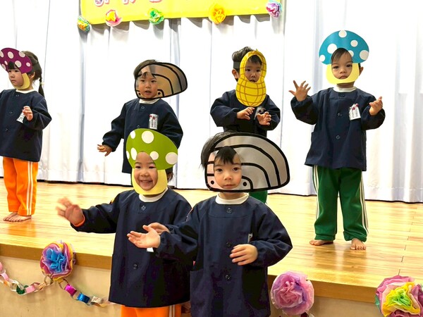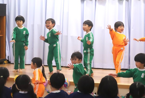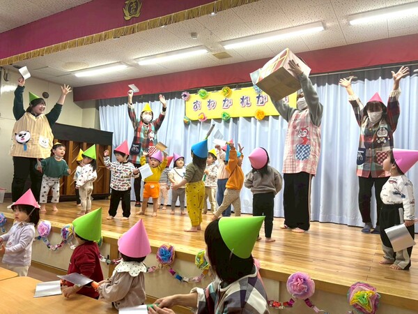 2026/03/23 お別れ会楽しかったよ☆(出し物編) 3月13日(金)にお別れ会がありました♪青組さんの司会でスタート!未満児クラスから順に出し物を披露しました!どのクラスもとっても楽しそうに踊ったり歌ったり…!出し物の後は各クラスから黄組さんに心をこめて作ったプレゼントを渡しました☺ 「ハイホー」の歌に合わせて宝箱を発見!(赤組) 発表会メドレーを披露♪(赤上組) 「はい!シーサー」(桃組) 「ありがとうの花」を歌った後、心をこめたメッセージ☆(青組) 「こたえあわせ」を歌った後、心のこもったメッセージ☆(黄組) 1 2 3 4 5 6 7