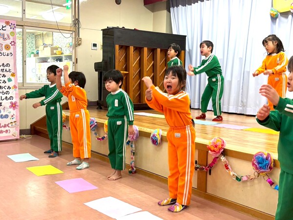 NEWS (0) 園ブログ (60) お知らせ (1) 2026/03/23 お別れ会楽しかったよ☆(出し物編) 3月13日(金)にお別れ会がありました♪青組さんの司会でスタート!未満児クラスから順に出し物を披露しました!どのクラスもとっても楽しそうに踊ったり歌ったり…!出し物の後は各クラスから黄組さんに心をこめて作ったプレゼントを渡しました☺ 「ハイホー」の歌に合わせて宝箱を発見!(赤組) 発表会メドレーを披露♪(赤上組) 「はい!シーサー」(桃組) 「ありがとうの花」を歌った後、心をこめたメッセージ☆(青組) 「こたえあわせ」を歌った後、心のこもったメッセージ☆(黄組) 1 2 3 4 5 6 7